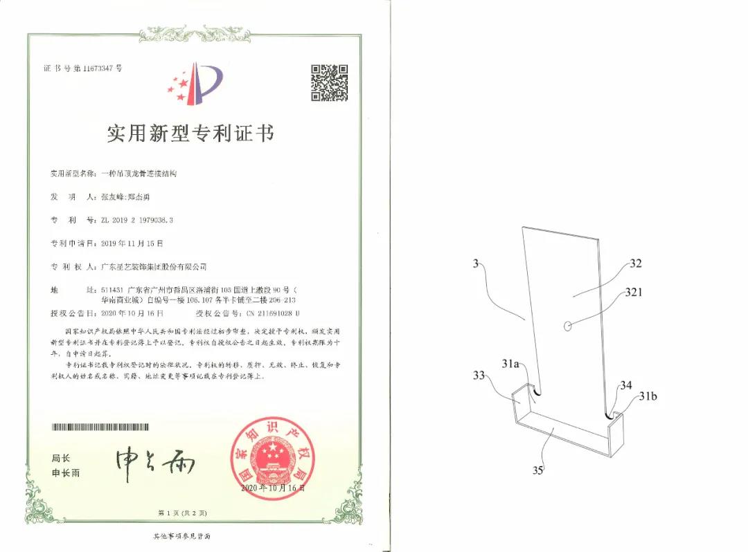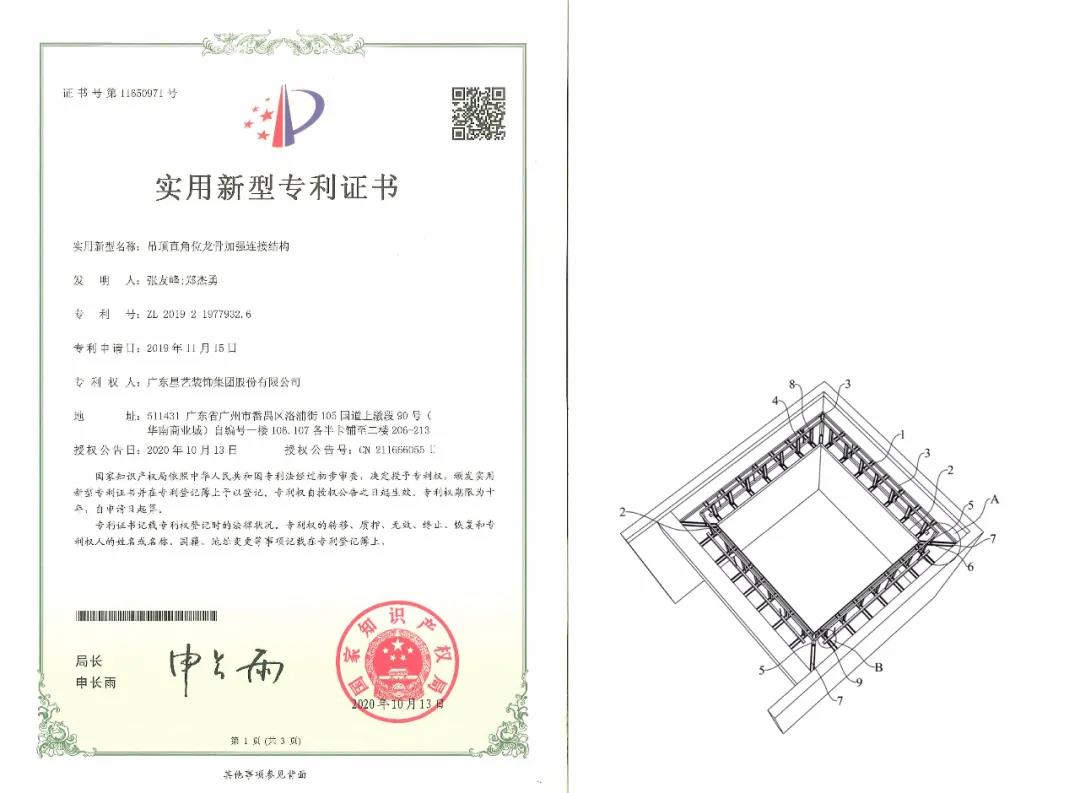 近日,星藝裝飾集團(tuán)取得“吊頂直角位龍骨加強(qiáng)連接結(jié)構(gòu)”、“一種吊頂龍骨連接結(jié)構(gòu)”實(shí)用新型專利,并獲得由國家知識產(chǎn)權(quán)局頒發(fā)的專利證書。