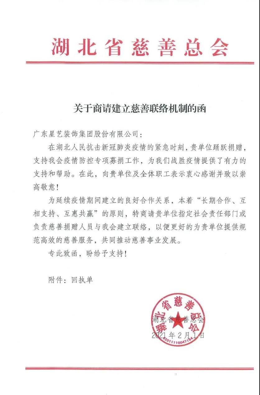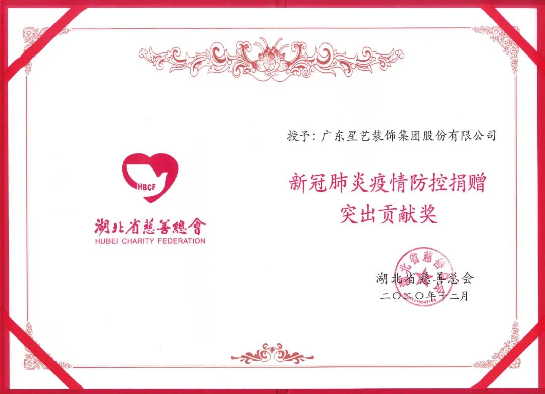 湖北省慈善總會授予廣東星藝裝飾集團“新冠肺炎疫情防控捐贈突出貢獻獎”。