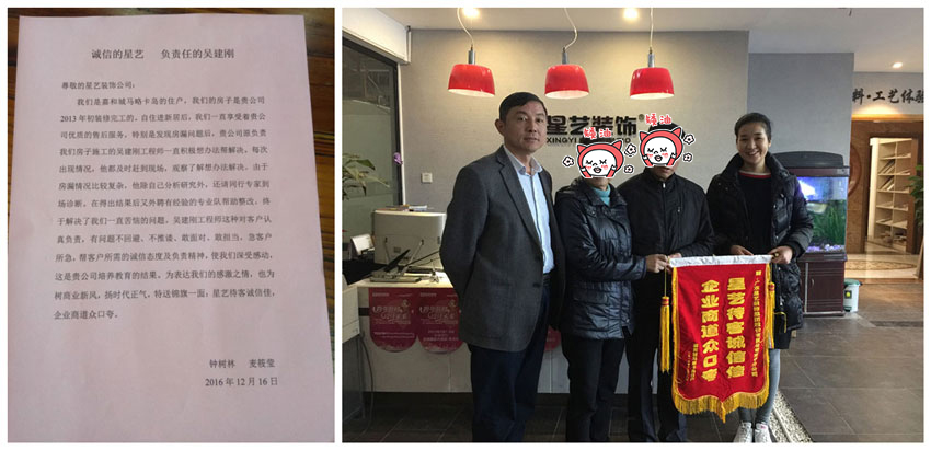 原文內(nèi)容大概如下:業(yè)主的房子是2013年交給星藝裝修的。入住新居后,一直享受星藝專業(yè)的五星售后服務(wù),發(fā)現(xiàn)房漏問題后,我公司項目經(jīng)理吳建剛堅持星藝有問題不回避、不推諉、敢面對,敢擔(dān)當(dāng)?shù)脑瓌t,急客戶所急,幫客戶所需的誠信態(tài)度及負(fù)責(zé)精神,業(yè)主深受感動,故送錦旗給予嘉獎。附上原文: