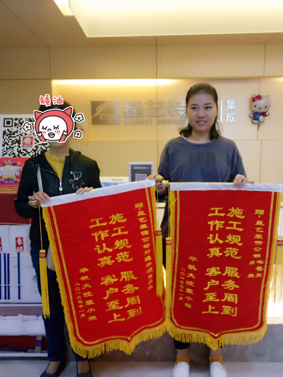 2016年12月6日送來(lái)錦旗,贊揚(yáng)星藝裝飾工作認(rèn)真負(fù)責(zé),施工規(guī)范,客戶至上,服務(wù)周到,設(shè)計(jì)師韋香美接受錦旗