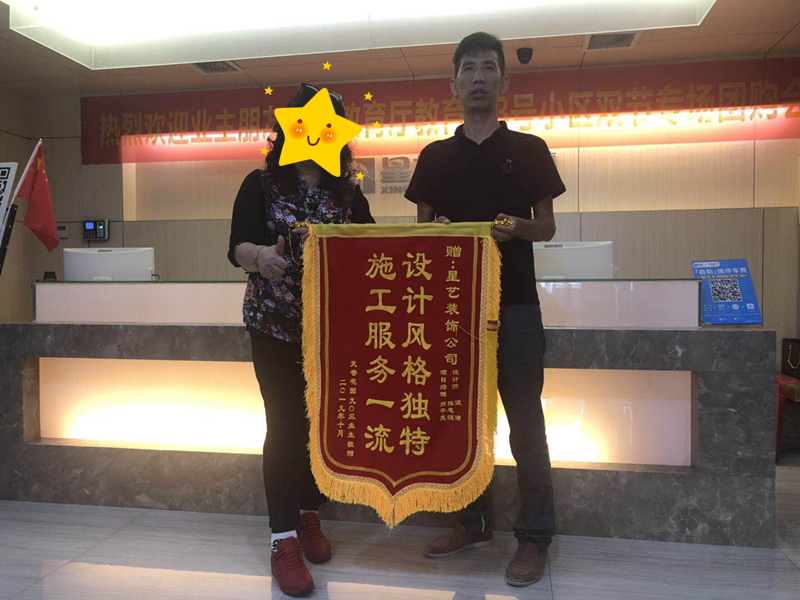 2019年10月,又一位天譽(yù)花園的業(yè)主送來錦旗,這是設(shè)計師陳忠波 項目監(jiān)理 周平亮近一個月收到的第二面錦旗,錦旗內(nèi)容:施工服務(wù)一流 設(shè)計風(fēng)格獨特