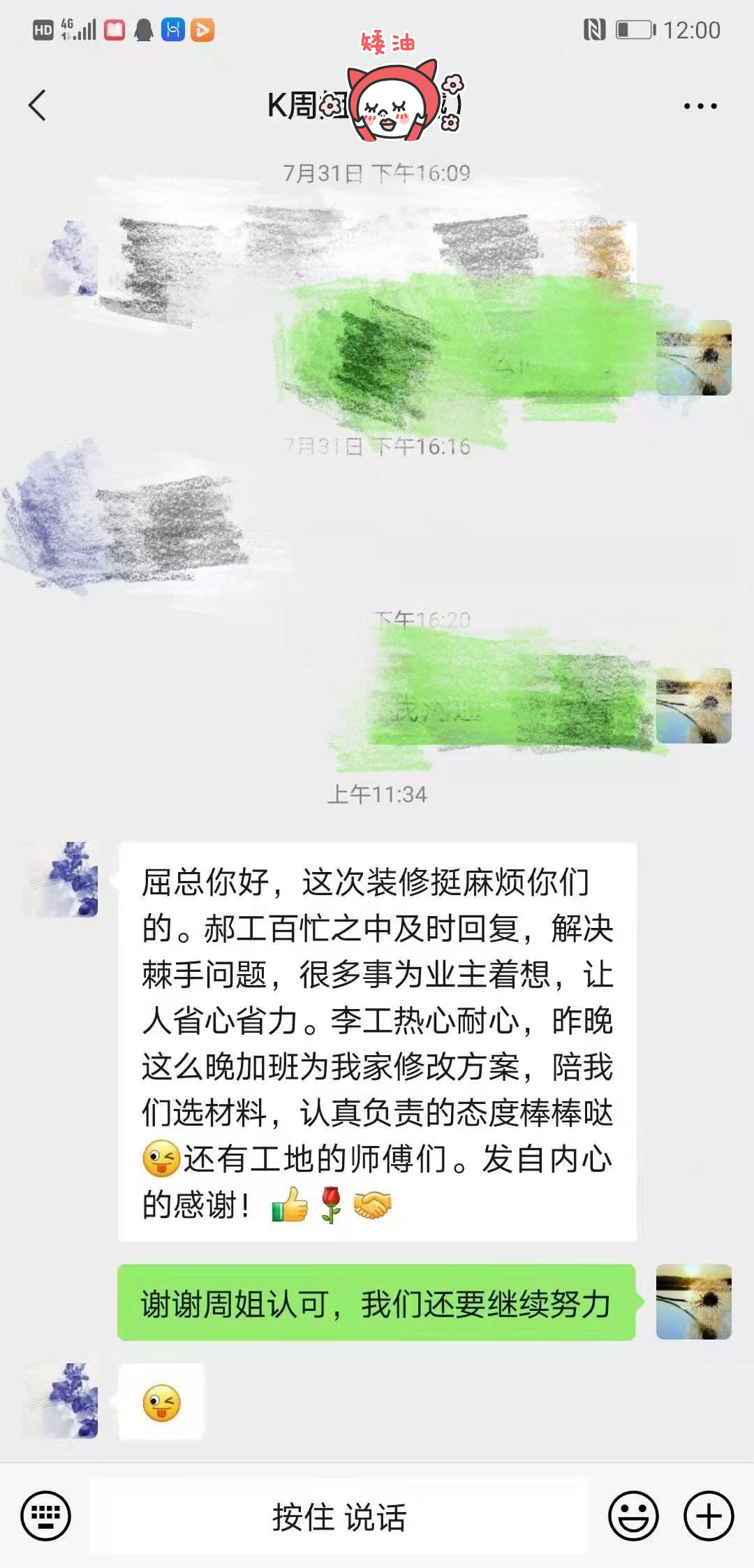 “屈總你好,這次裝修挺麻煩你們的,郝工百忙之中及時(shí)回復(fù),解決棘手問題,很多事為業(yè)主著想,讓人省心省力。李工熱心耐心,昨晚這么晚加班為我家修改方案,陪我們選材料,認(rèn)真負(fù)責(zé)的態(tài)度棒棒噠,還有工地的師傅們,發(fā)自內(nèi)心的感謝!”
