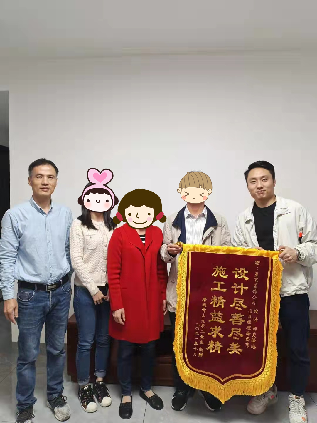 來自唐樾青山業(yè)主將一面印有“施工精益求精 設(shè)計盡善盡美”的大紅錦旗送到星藝裝飾,以感謝星藝裝飾的裝修質(zhì)量和服務(wù),項目經(jīng)理徐西京,設(shè)計師史澤海接收錦旗并和業(yè)主合影