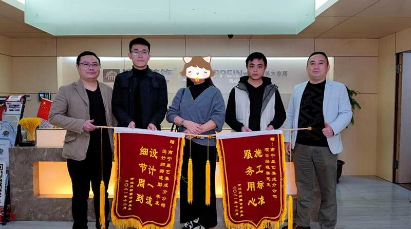 2021年12月5日萬(wàn)達(dá)茂御墅仕家業(yè)主送來(lái)兩幅錦旗,分別贈(zèng)予設(shè)計(jì)師郝建勛 李發(fā)設(shè)計(jì)師和項(xiàng)目經(jīng)理廖亮發(fā),錦旗內(nèi)容:設(shè)計(jì)一流 細(xì)節(jié)周到,施工標(biāo)準(zhǔn) 服務(wù)用心