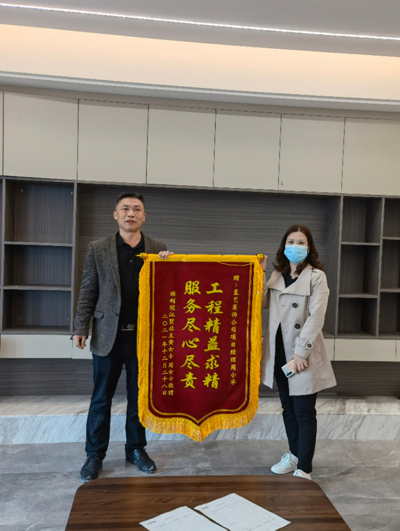 2022年元旦過后,來自保利冠江墅業(yè)主將一面印有“工藝精益求精,服務(wù)盡心盡責(zé)”的大紅錦旗送到星藝裝飾,以感謝星藝裝飾的裝修質(zhì)量和服務(wù)。