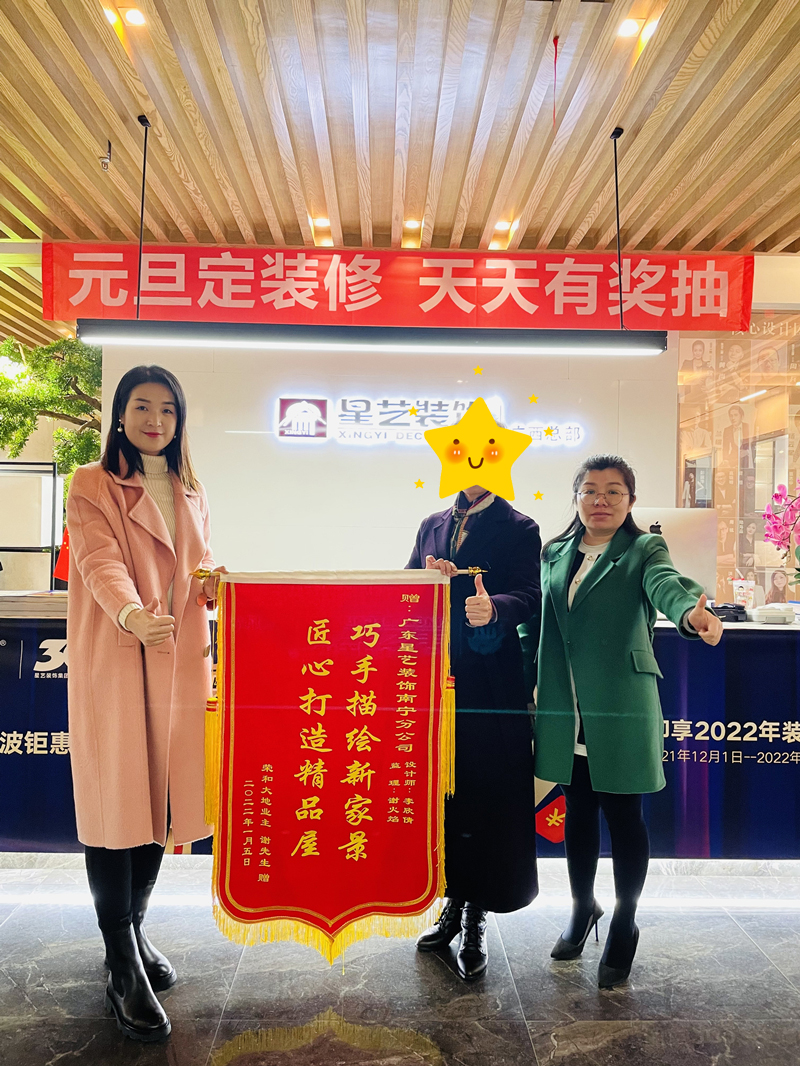 2022年元旦過(guò)后,來(lái)自榮和大地業(yè)主將一面印有“匠心打造精品屋,巧手描繪新家景”的大紅錦旗送到南寧星藝裝飾總店,以感謝星藝裝飾的裝修質(zhì)量和服務(wù)。設(shè)計(jì)師李欣倩與之合影紀(jì)念