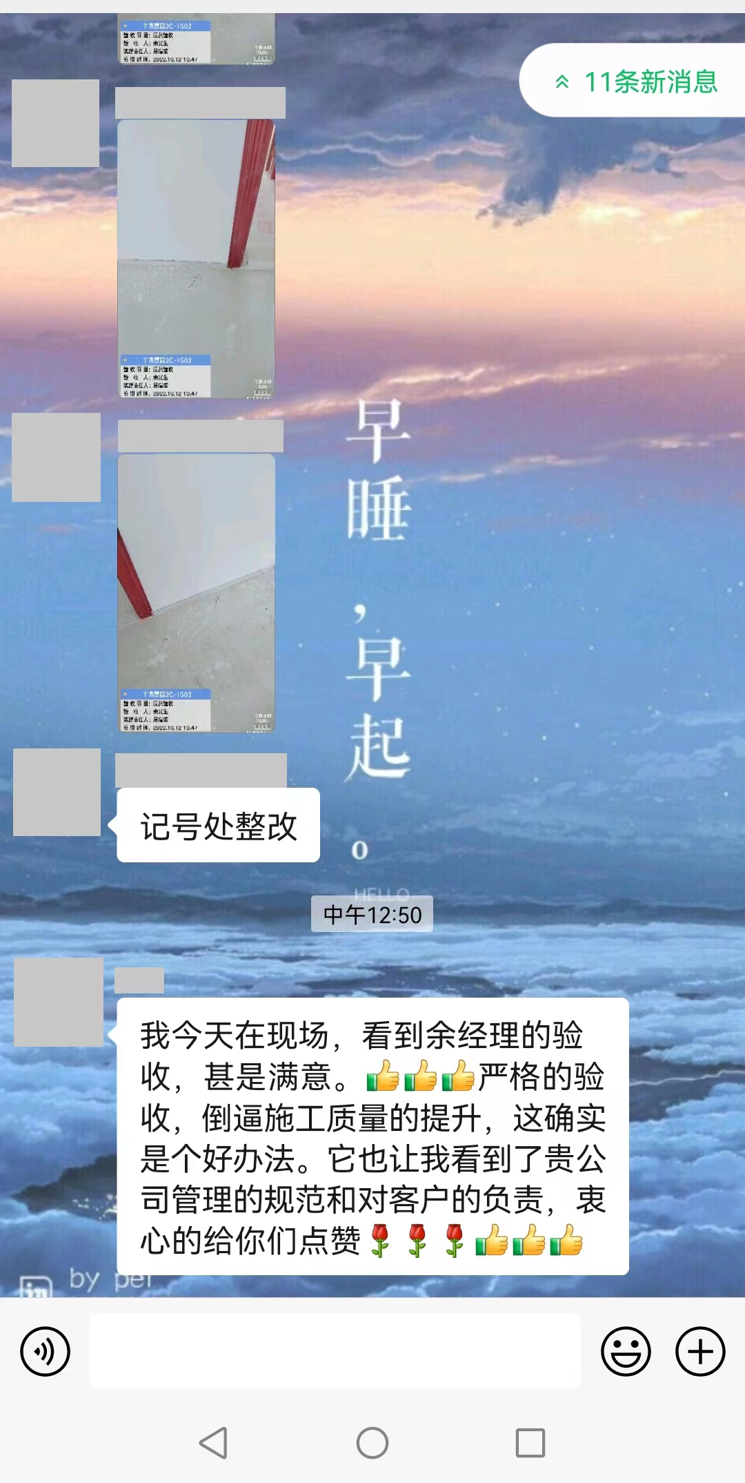 我今天在現(xiàn)場,看到余經(jīng)理的驗收,甚是滿意。嚴格的驗收,倒逼施工質(zhì)量的提升,這確實是個好辦法,這也讓我看到了貴公司管理的規(guī)范和對客戶負責,衷心的給你們點贊!
