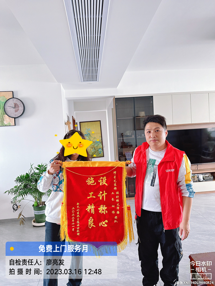 2023年3月16日,一年一度的免費上門服務月中,來自新民小區(qū)的陳女士把制作已久的錦旗送給前來上門服務的項目經(jīng)理,業(yè)主陳女士和項目經(jīng)理合影留念,錦旗內(nèi)容 設計稱心 施工精良