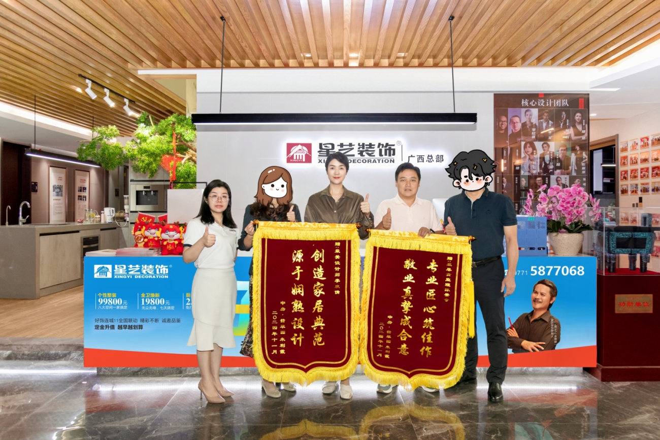 近日,在星藝裝飾廣西總部迎來了一個充滿喜悅和榮譽的時刻。中房翡翠園小區(qū)的一位業(yè)主特地送來兩幅錦旗,以表彰我們團隊在裝修項目中的卓越表現(xiàn)。這兩幅錦旗分別贈與設(shè)計師李欣倩和項目經(jīng)理陳景奇,內(nèi)容分別為:“源于嫻熟設(shè)計 創(chuàng)造家居典范”和“敬業(yè)真摯成合意 專業(yè)匠心筑佳作”。