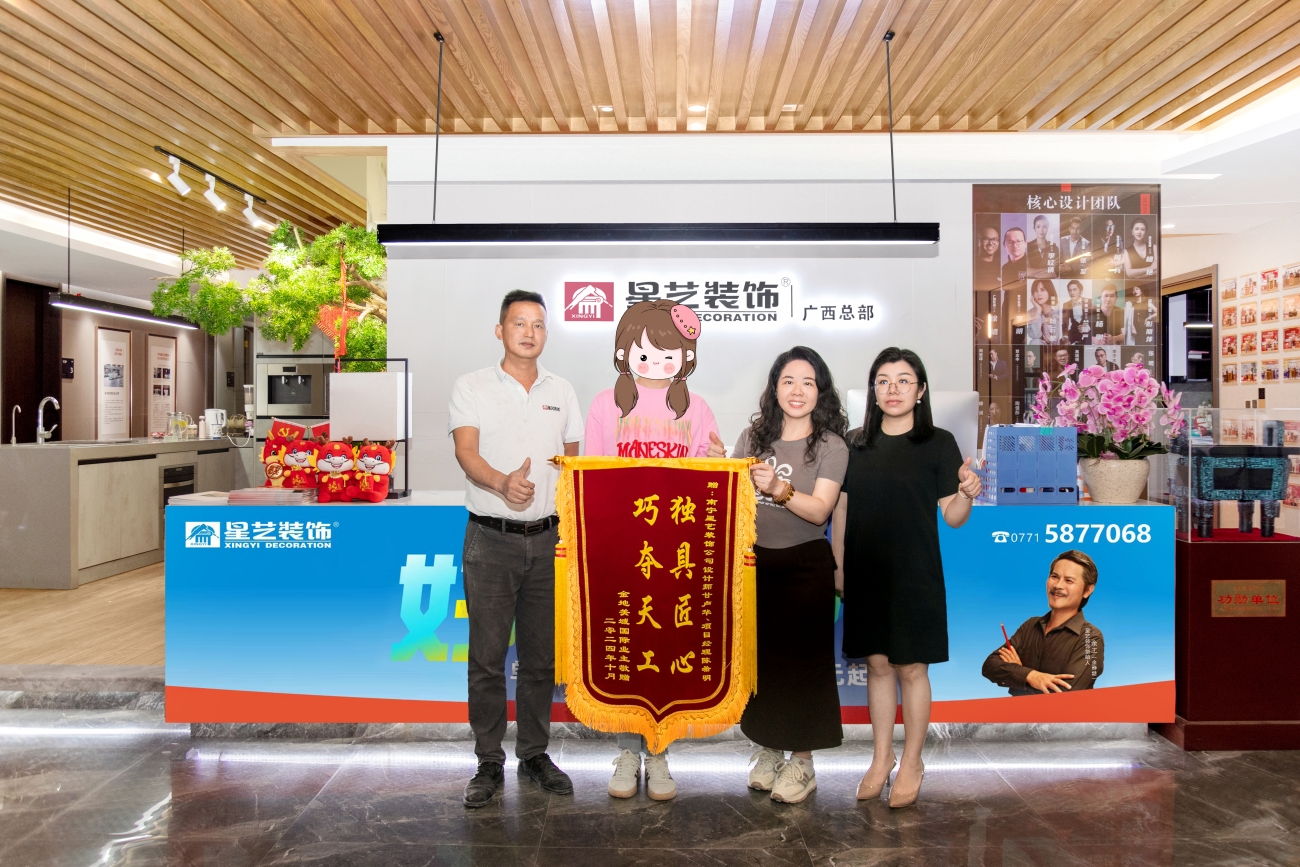 今日,星藝裝飾廣西總部迎來了一段溫馨而榮耀的時(shí)刻。金地美域國際小區(qū)的一位業(yè)主特地送來了一幅錦旗,以表彰我們團(tuán)隊(duì)在裝修項(xiàng)目中的卓越表現(xiàn)。這幅錦旗上題寫著“巧奪天工 獨(dú)具匠心”,表達(dá)了業(yè)主對我們工作的高度認(rèn)可和由衷感謝。設(shè)計(jì)師甘盧華和項(xiàng)目經(jīng)理陳希明與業(yè)主共同合影留念,記錄下了這一珍貴的瞬間。
