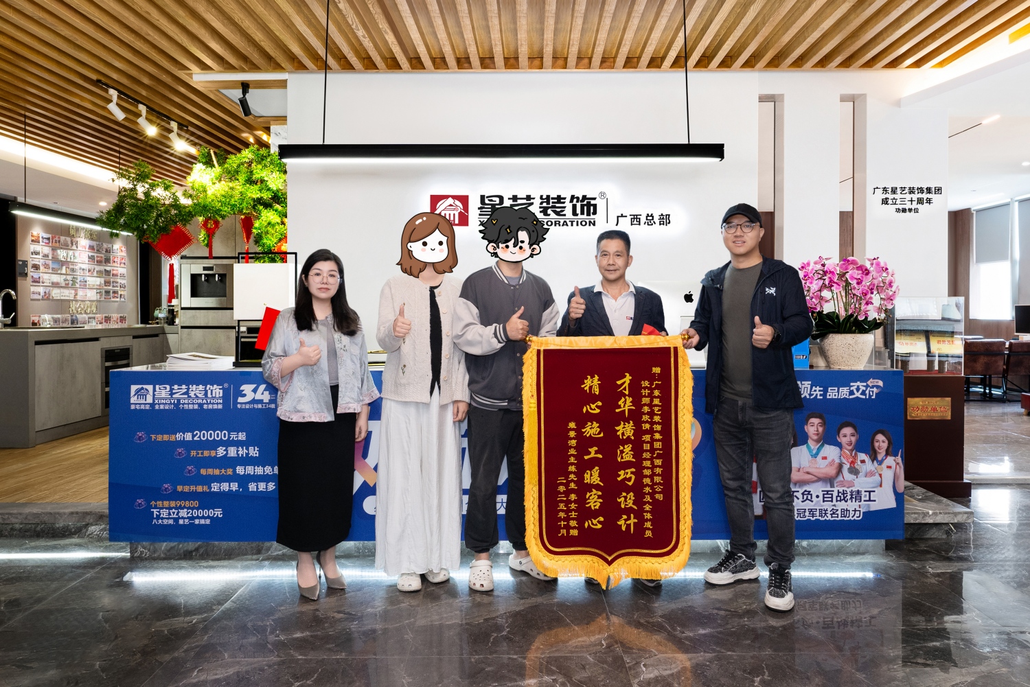 金秋送爽,贊譽隨行。2025年11月初,南寧招商雍景灣的業(yè)主親臨星藝裝飾匯東店,將一幅承載著滿滿認可與謝意的錦旗,鄭重交到了項目團隊手中。錦旗上,“精心施工暖客心,才華橫溢巧設計”十四個鎏金大字,不僅是對項目經理鄒德水先生精湛工藝與細致管理的由衷贊嘆,也是對匯東設計部經理謝麗萍女士卓越品味與創(chuàng)新構思的高度嘉許。
