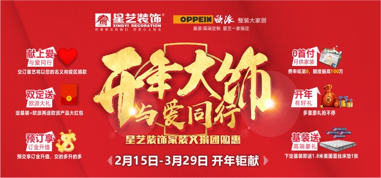 新冠肺炎疫情牽動著每一個星藝人的心,一方有難,八方支援,全國星藝人開啟集團(tuán)發(fā)起的“愛心接龍。連日來,星藝全國眾多單位積極捐款,星藝員工自愿捐款,甚至星藝客戶也通過“愛心接龍”捐款,截止 2 月 10 日已籌善款 205 萬元……首批 50 萬個醫(yī)用外科口罩和 1 萬個醫(yī)用防護(hù)口罩已定向捐助到相關(guān)醫(yī)院,并獲得了人民日報的報道肯定,危難之時見真情,星藝奉獻(xiàn)有大愛。同心抗疫,為愛前行!星藝南寧分公司特推出開年大飾,與愛同行,家裝義捐團(tuán)購惠裝修活動,具體優(yōu)惠如下: