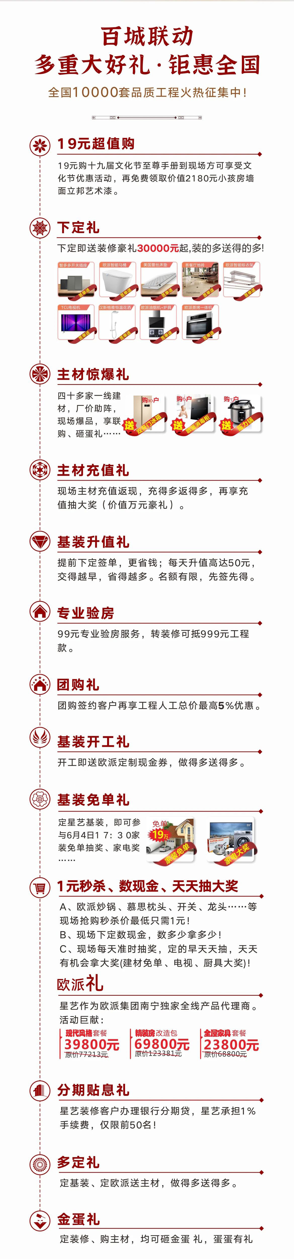 2023年中國星藝第19屆家裝文化節(jié),全國400多家直營門店聯(lián)動,年度巔峰讓利,搶2億裝修豪禮,讓幸福啟程。星藝人將以最專業(yè)的團隊,最經(jīng)典的設(shè)計,最貼心的服務(wù)、最堅實的品質(zhì)、最期待的鉅惠,將一場裝飾文化盛宴,獻禮綠城,具體優(yōu)惠如下: