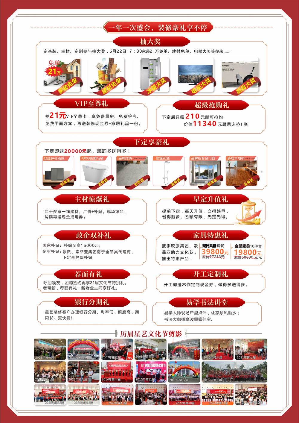 2025年中國星藝第21屆家裝文化節(jié),全國400多家直營門店聯(lián)動(dòng),年度巔峰讓利,搶2億裝修豪禮,讓幸福啟程。星藝人將以最專業(yè)的團(tuán)隊(duì),最經(jīng)典的設(shè)計(jì),最貼心的服務(wù)、最堅(jiān)實(shí)的品質(zhì)、最期待的鉅惠,將一場裝飾文化盛宴,獻(xiàn)禮綠城,具體優(yōu)惠如下: