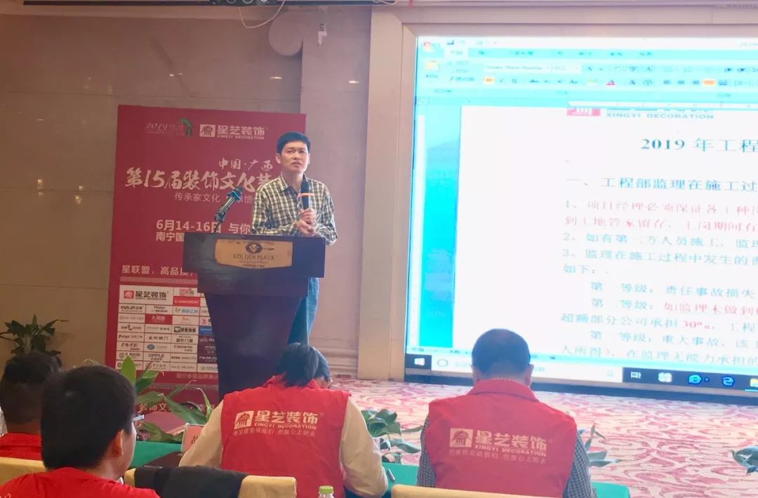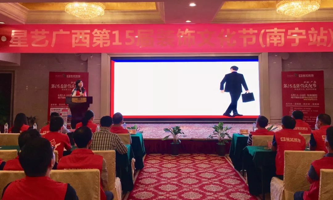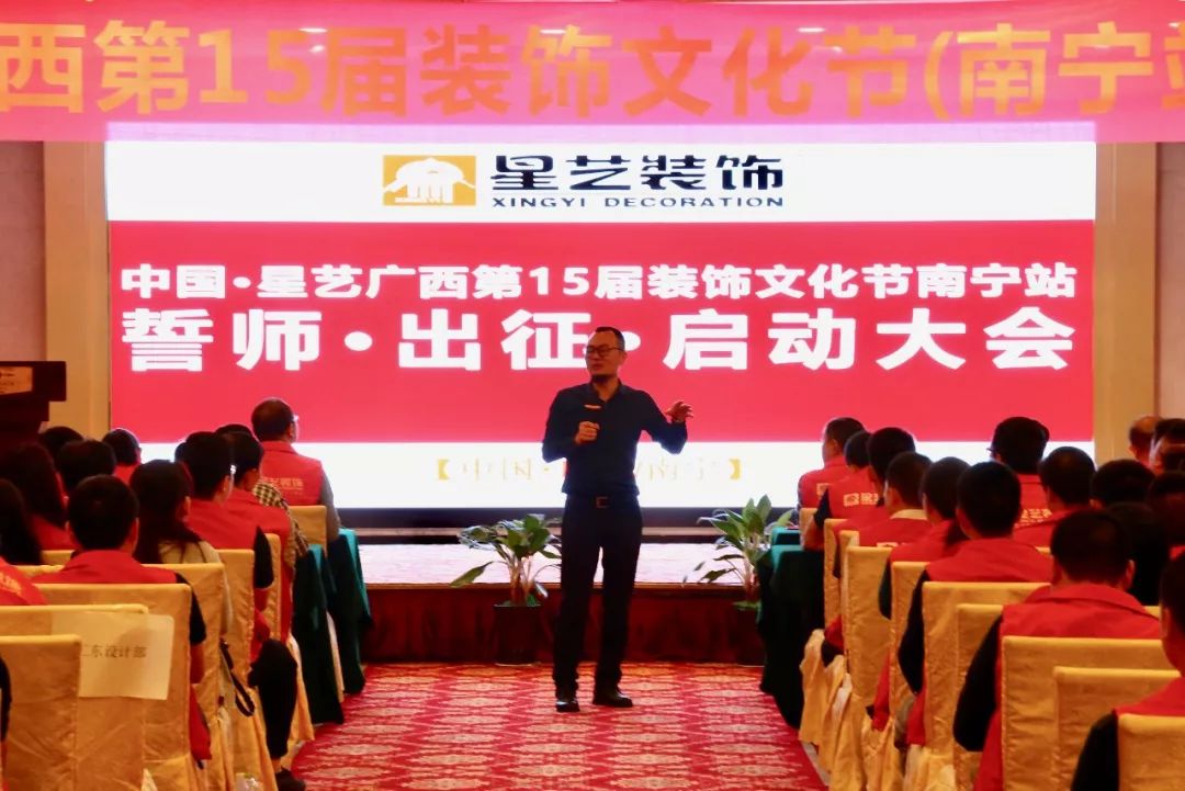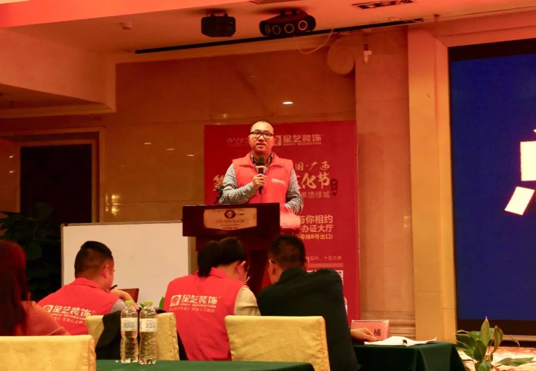 隨后,星藝南寧區(qū)域總監(jiān)李明上臺(tái)闡述十五屆裝飾文化節(jié)(南寧站)的策劃方案、優(yōu)惠細(xì)則、活動(dòng)推廣、獎(jiǎng)勵(lì)制度政策和方案,講解星藝九大家設(shè)計(jì)哲學(xué)思想、質(zhì)量和服務(wù)標(biāo)準(zhǔn)以及市場變化等。李工也不禁感慨萬千,從第一屆裝飾文化節(jié)延續(xù)至今全部參與了南寧的15屆,從第一屆的30單到十四的603單,把自已首屆簽8單的好成績放在今日相比,其實(shí)不算得什么,但這亦是證明了星藝一直在不斷強(qiáng)大,未來可期,勇攀高峰,相信在本屆裝飾文化節(jié)中,星藝家人們亦能取到更為耀眼的成績,再次刷新2018年的記錄。