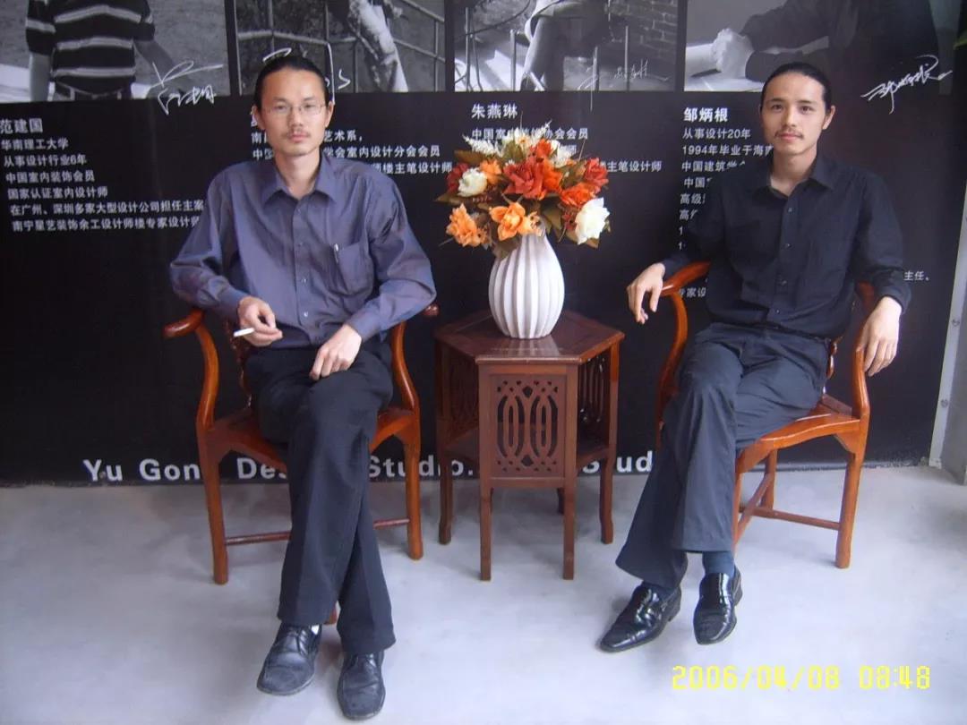 ▲2006年余工樓創(chuàng)建,設計總監(jiān)王時雨(右)與設計總監(jiān)李明(左)合影。