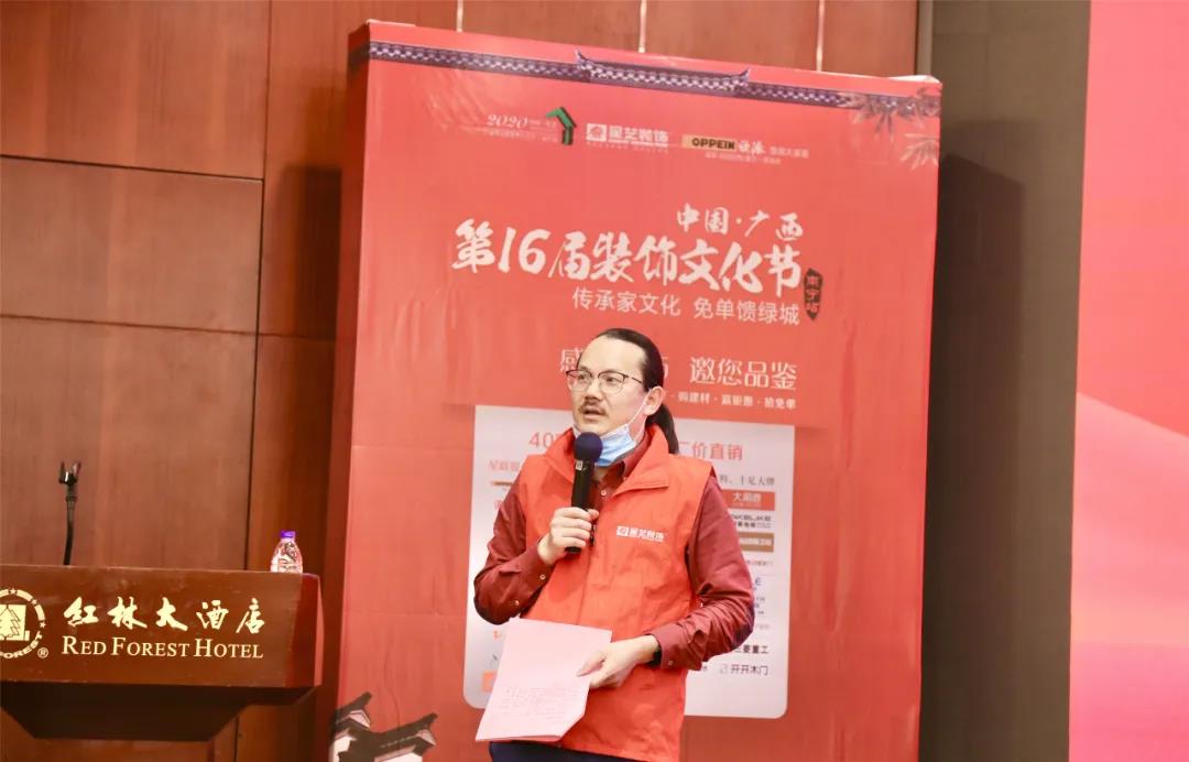 首先,星藝南寧區(qū)域設(shè)計總監(jiān)李明上臺講解第十六屆裝飾文化節(jié)(南寧站)的策劃方案、優(yōu)惠細(xì)則;李工結(jié)合2020年實(shí)際情況,仔細(xì)分析了活動方案上的每一處細(xì)節(jié),并不斷闡述2020年活動新的調(diào)整,以及活動新的推廣方式,現(xiàn)場展現(xiàn)了星藝在基于原有的基礎(chǔ)上,也在創(chuàng)新進(jìn)取,不斷強(qiáng)大,亦表明在本屆裝飾文化節(jié)中下足了“功夫”,希望每位星藝家人能借此良機(jī),取得更為耀眼的成績,再次刷新2019年的記錄。