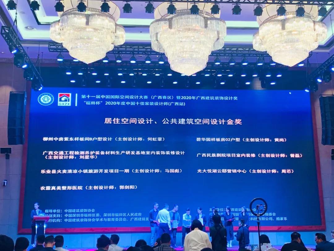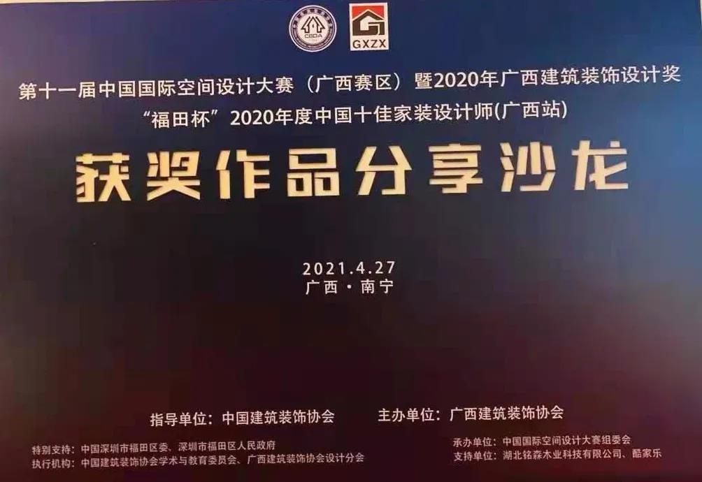 2021年4月27日,第十一屆中國國際空間設(shè)計大賽(廣西賽區(qū))暨2020年廣西建筑裝飾設(shè)計獎“福田杯”2020年度中國十佳家裝設(shè)計師(廣西站)在廣西南寧南湖名都大酒店三樓舉行。來自廣西各單位的設(shè)計師和獲獎?wù)啐R聚一堂,用設(shè)計詮釋藝術(shù)空間,展示最好、最優(yōu)、最新的設(shè)計成果。