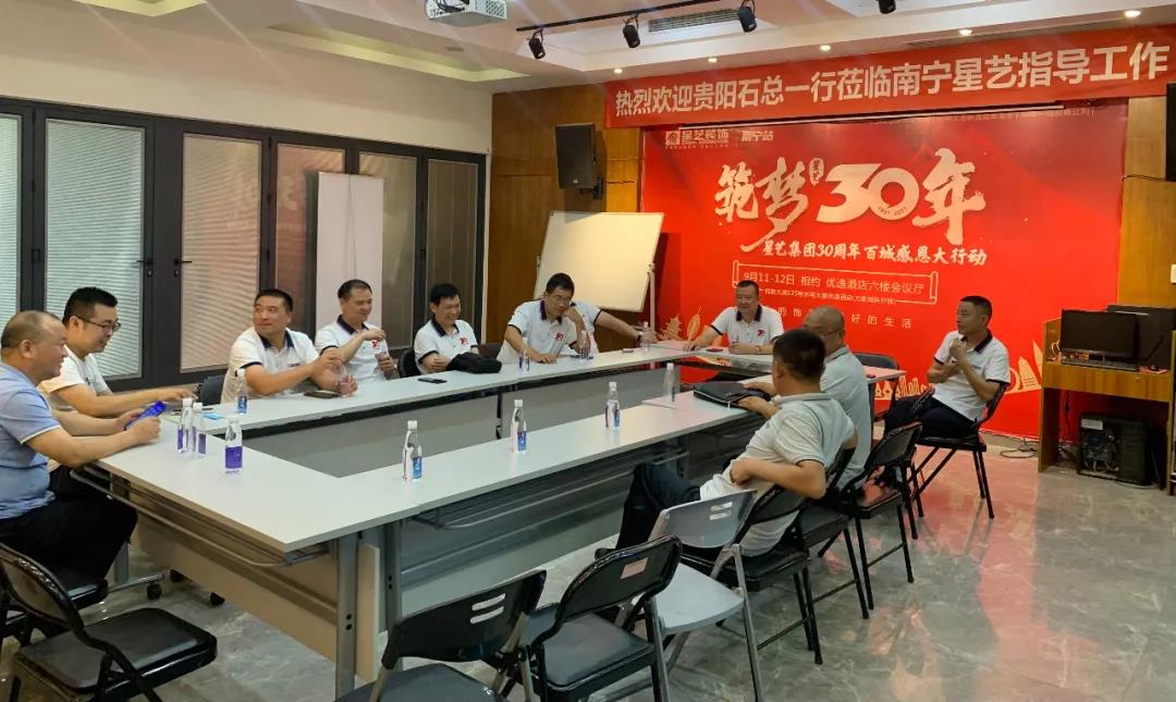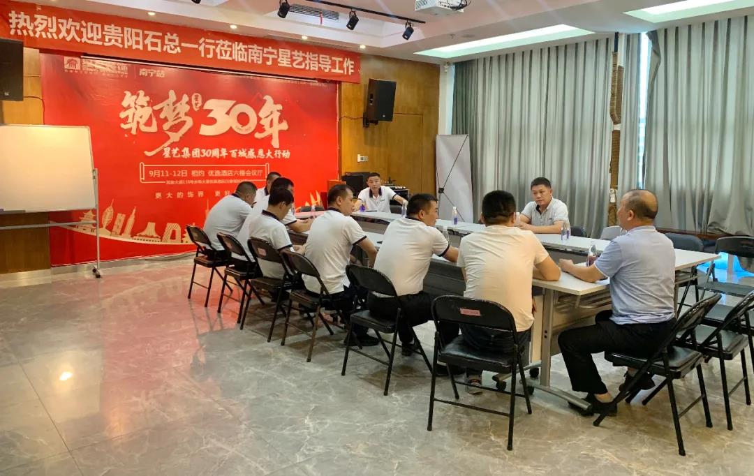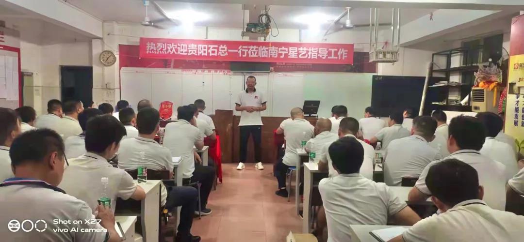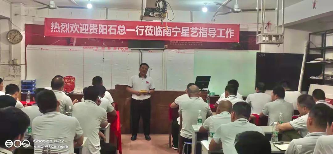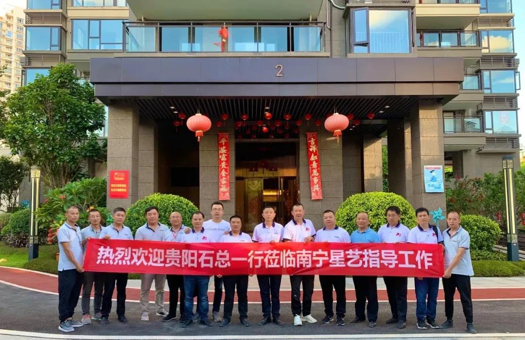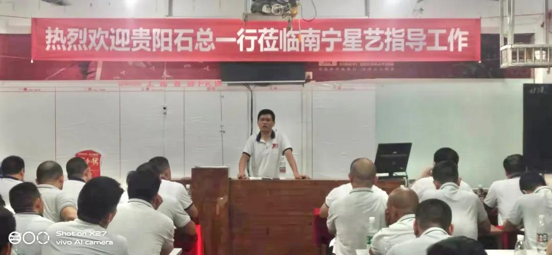 2021年8月29日,星藝貴陽公司石學軍、星藝凱里公司寧歸君、星藝畢節(jié)公司寧擁名等經理一行人蒞臨星藝南寧交流指導工作,在星藝裝飾南寧公司總經理周平生、工程總監(jiān)柯善林、黃江水及質檢總監(jiān)余光生等領導的陪同下,貴陽&南寧兩地的兄弟公司就南寧工程管理進行了交流與探討。