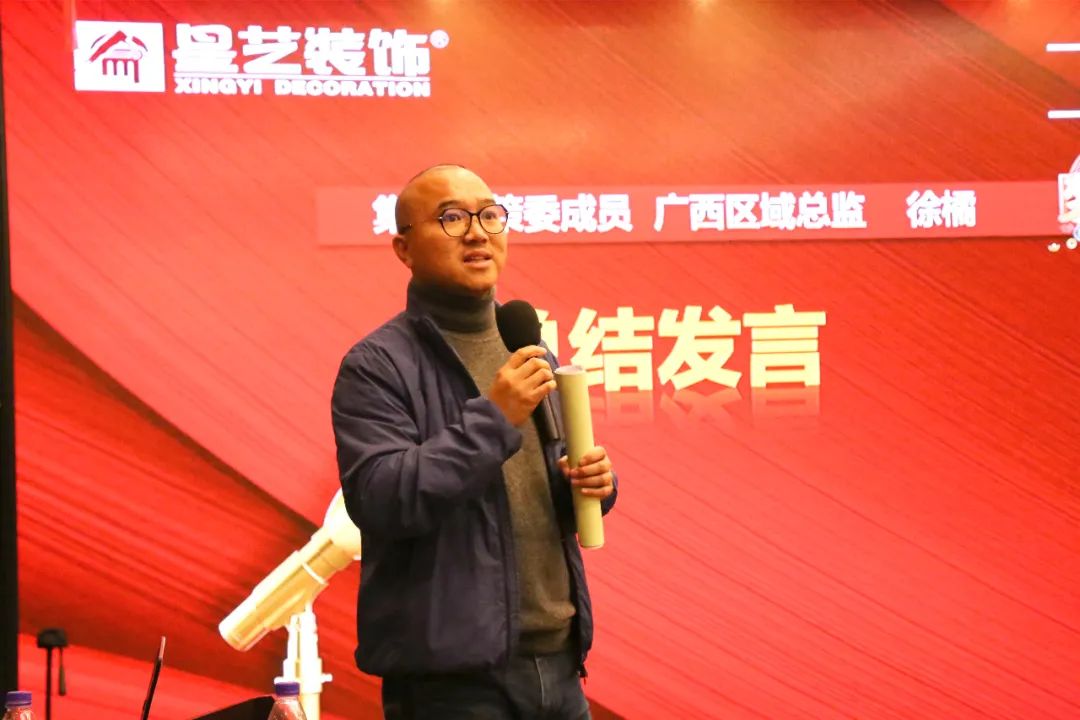 最后,集團(tuán)決策委成員、廣西區(qū)域設(shè)計(jì)總監(jiān)徐橘做會(huì)議總結(jié),徐總先是以南寧裝修市場形勢(shì)做了簡要的分享,并結(jié)合自己去外地市場考察,見到一些新的東西,分享到“因?yàn)槭袌鲈谧兓袠I(yè)在變化,不管是工程部也好,營銷部、設(shè)計(jì)部也好,相互之間一定要懂得總結(jié)和復(fù)盤?!蓖ㄟ^慢慢地去做一些市場的復(fù)盤,去解決細(xì)部節(jié)點(diǎn)的問題,保持活躍性,不斷調(diào)整自己的模式,從而打造出企業(yè)的共同目標(biāo)。