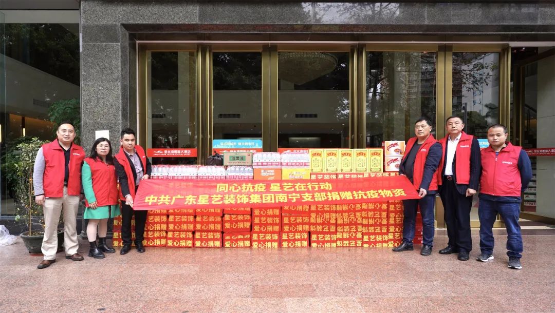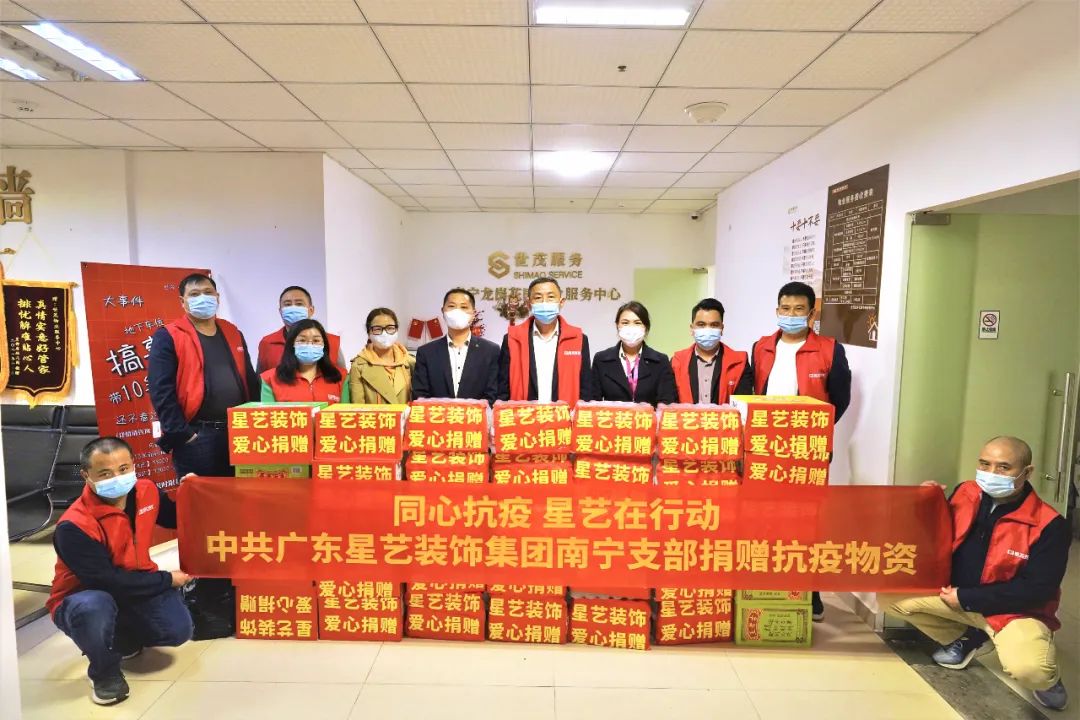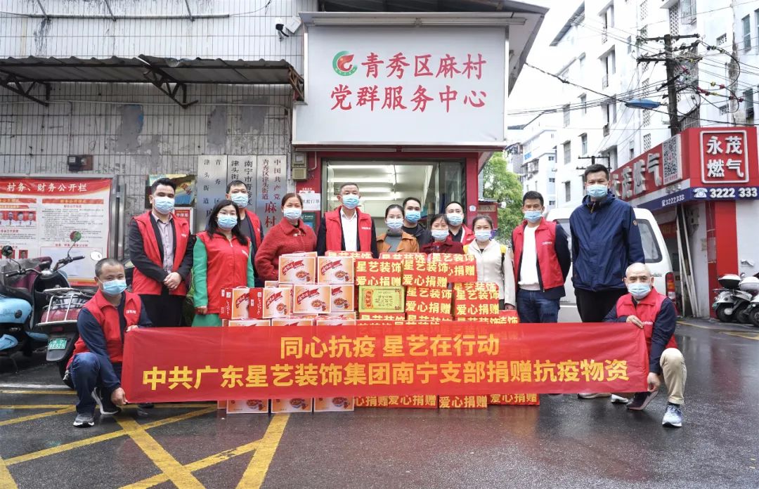 3月23日,在中共廣東星藝裝飾集團南寧支部書記周平生的帶領(lǐng)下,星藝裝飾南寧公司黨員員工和部門負責(zé)人,前往青秀麻村黨群服務(wù)中心和世茂、江南院子、錦繡新城物業(yè)疫情防控現(xiàn)場,將體溫槍、消毒液和食品飲料等防疫物資捐贈奮戰(zhàn)在防疫一線的工作人員。戰(zhàn)疫情,送溫暖,弘揚南寧“能幫就幫”的精神,凝心凝力,為南寧抗擊疫情貢獻自己的一份力量。