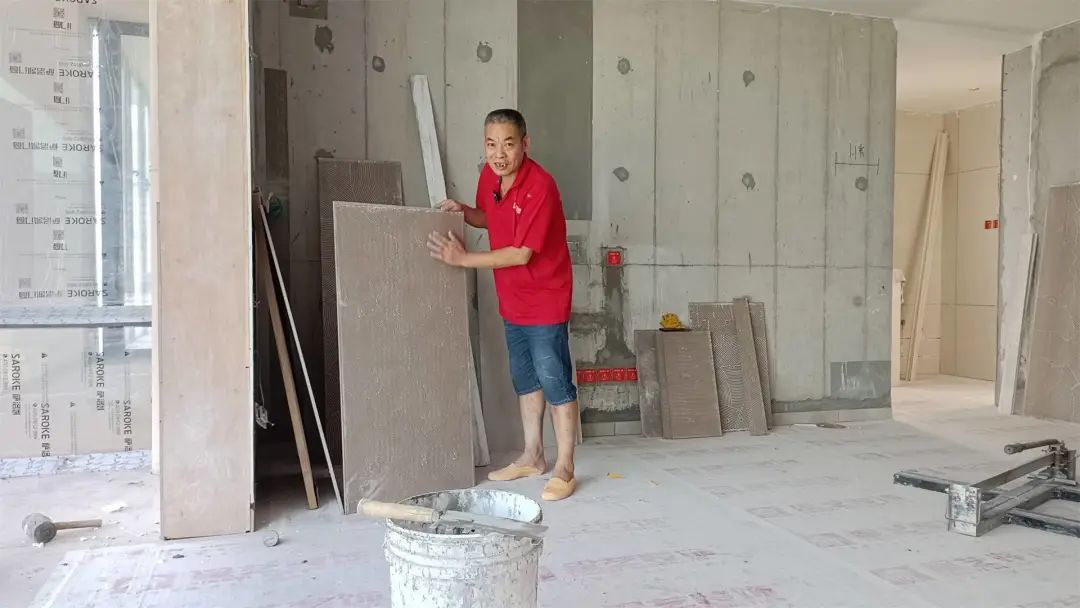 莫樹文以前鋪800毫米×800毫米的瓷磚,每天能鋪10平方米左右,現(xiàn)在鋪750毫米×1500毫米,一天依然只能鋪10平方米左右,因為必須把速度放慢,才能確保大磚鋪貼的質量。其中一個鋪地磚的細節(jié)顯示,每塊大磚必須排版試鋪,再根據具體情況用干沙微調沙漿層,直至調平,然后才能正式上漿鋪貼。莫樹文說,如果不試鋪,直接用濕漿來找平,就容易因濕漿厚度不一、干燥速度不一樣而出現(xiàn)空鼓,圖省事或缺乏經驗的工人會省掉這個環(huán)節(jié)。