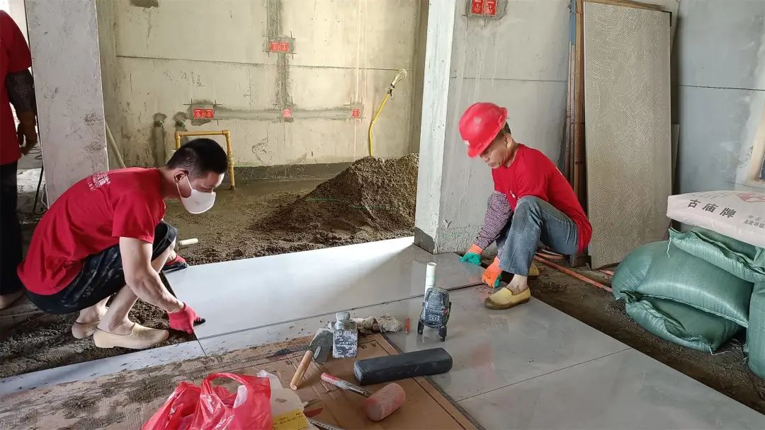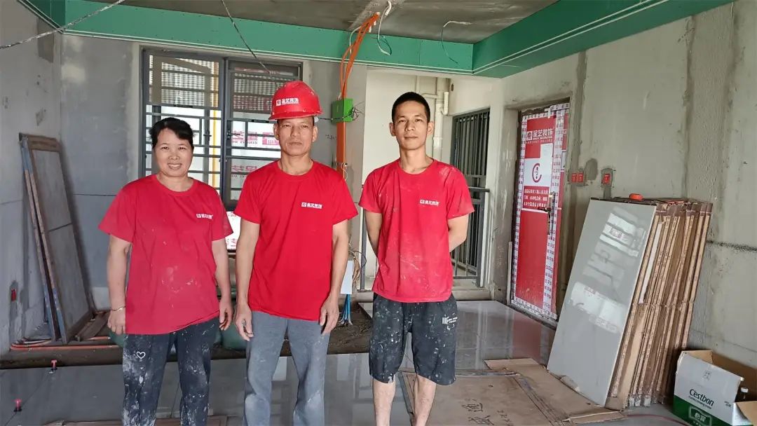 兩位鋪磚老師傅除了自己優(yōu)秀,還影響到了下一代,先后將兒子帶入裝修行業(yè),且加入星藝南寧,成為了“星二代”。莫樹文的兒子莫炳健1992年出生,2014年底進入星藝南寧,迄今已有8年時間。莫炳健在星藝干的這8年,一直專注于鋪磚工藝。2022年11月上旬,父子搭檔鋪磚的身影出現(xiàn)在南寧西園悅府小區(qū)一個星藝工地?,F(xiàn)場所鋪的地磚較大,每片地磚需父子兩人配合才能鋪好。工地上,還有莫樹文的妻子幫忙,協(xié)助父子拌漿、上漿。一家人同框出現(xiàn)在一個工地的場景,畫面默契而又溫馨。