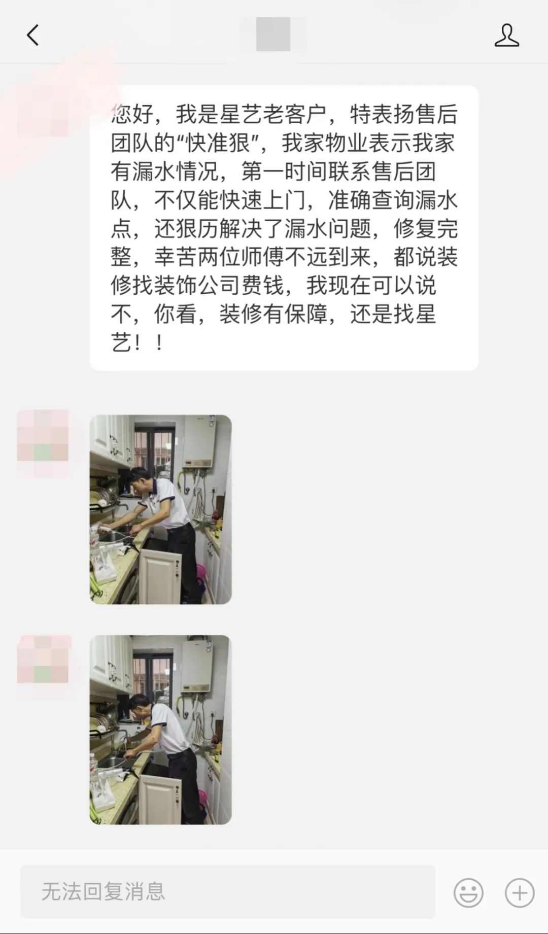 在服務(wù)月期間,有位2016年的老客戶主動聯(lián)系我們,經(jīng)過售后部門核對后立即安排工程部項目監(jiān)理周平彬上門為老客戶排查問題,事后客戶十分認(rèn)可星藝裝飾的服務(wù)。 還有在回訪解決完一位榮和山水綠城業(yè)主的廚房問題后,業(yè)主深受觸動,親自到公司官微留言,贊許星藝裝飾“裝修有保障”。
