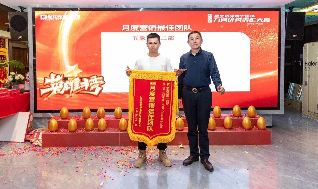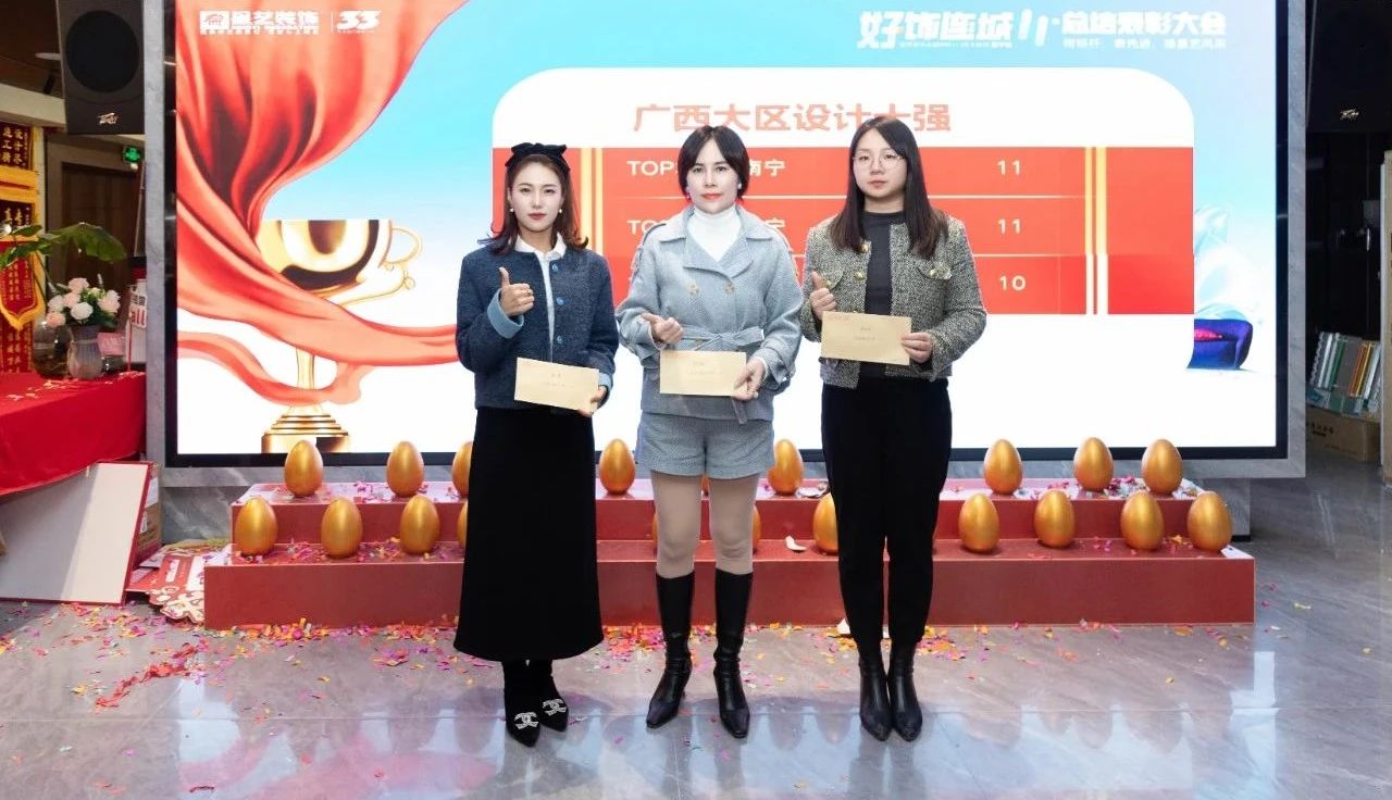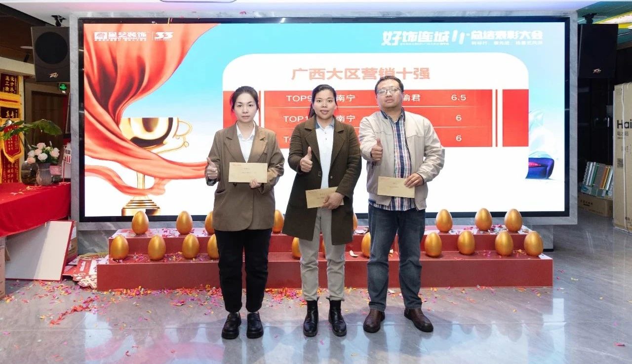 緊接著,大會(huì)進(jìn)入“好飾連城11(南寧站)”總結(jié)表彰環(huán)節(jié),在此次活動(dòng)中,經(jīng)過星藝家人們的共同努力,創(chuàng)下獲508戶業(yè)主選擇的歷史佳績(jī)新高,再度彰顯星藝裝飾創(chuàng)立33年的品牌魅力;其中涌現(xiàn)出了許多優(yōu)秀的團(tuán)隊(duì)及個(gè)人,他們齊心奮進(jìn),勇創(chuàng)佳績(jī),為其他星藝家人樹立標(biāo)桿,樹立“星”榜樣;會(huì)議現(xiàn)場(chǎng),周總、李工、胡總也分別為其頒發(fā)活動(dòng)獎(jiǎng)勵(lì)及證書。