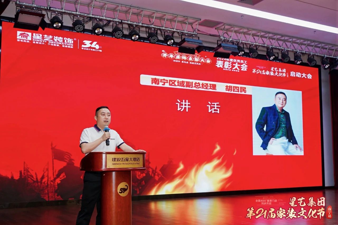 緊接著,會(huì)議進(jìn)入2024年度總結(jié)表彰暨2025年度工作部署環(huán)節(jié),星藝南寧總經(jīng)理周平生上臺(tái)致辭,周總簡要概述2024年星藝南寧所取得的佳績,肯定了星藝全體家人凝心聚力,保持業(yè)績持續(xù)增長的勢(shì)頭;同時(shí)期待2025年星藝裝飾再次勇攀高峰,取得佳績。