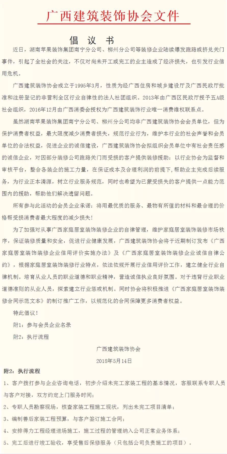 不僅如此,會上還發(fā)起行業(yè)倡議援助受損消費者。星藝南寧積極響應(yīng)廣西建筑裝飾協(xié)會以及廣東星藝集團的號召:在業(yè)主自行負擔(dān)成本的前提下,為受損業(yè)主提供幫助。用優(yōu)質(zhì)的服務(wù)、合理的價格完成受損業(yè)主的后續(xù)工程,最大程度減少損失!