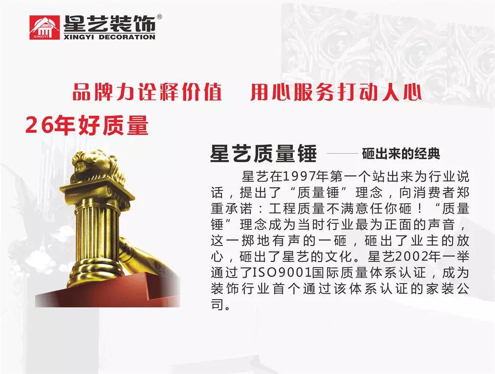 星藝裝飾1991年創(chuàng)立于廣州,2002年入駐廣西,“誠信正直,勇于奉獻”是星藝人一直所追求的精神。星藝裝飾始終秉持“健康家居,品質(zhì)生活”的經(jīng)營理念,無論是首推全國聯(lián)保、“質(zhì)量錘”宣言,還是工藝精研、人才培養(yǎng),這無一不彰顯出星藝“客戶贊許”的企業(yè)價值觀。正如我們所踐行“把裝修交給我們,您放心上班去”的承諾一樣,高舉“誠信裝修”大旗,用品質(zhì)為愛筑巢。